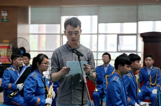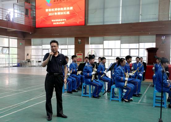 在學院電聲樂團和學生古箏表演助興演出后,軍樂團強訓匯報正式拉開帷幕。學院軍樂團指導胡勇老師為廣大師生介紹了軍樂團組建、訓練的基本情況。胡老師為大家介紹了在各系的支持下,學院軍樂團4月初恢復組建訓練,聘請專業(yè)教師自5月21日開始首次授課,至6月13日,共授課9次,團員由樂理知識零基礎到能夠流暢演奏出兩首曲目的過程。軍樂團主席劉康睿同學組織樂團各聲部團員介紹本聲部在軍樂團中的作用。軍樂團的首秀贏得了在場師生的陣陣掌聲。