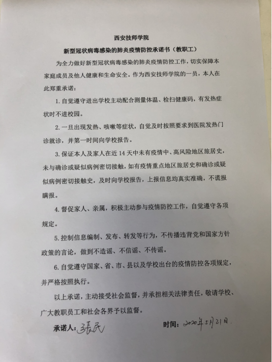 項(xiàng)雯在簽署承諾書時(shí)提到,作為一名教師要以身作則,自覺(jué)遵守進(jìn)出門測(cè)體溫掃碼等,如果有發(fā)熱癥狀及時(shí)就醫(yī)及時(shí)上報(bào),不進(jìn)校園。