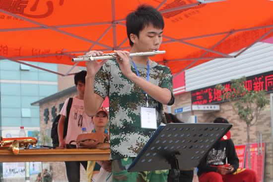 每當(dāng)學(xué)生們軍訓(xùn)累了,教官讓大家就地休息時(shí),他們就會(huì)出現(xiàn)在那里,支起樂(lè)譜,做個(gè)簡(jiǎn)短的自我介紹,開(kāi)始演奏一首首耳熟能詳?shù)臉?lè)曲,為緊張、嚴(yán)肅的軍訓(xùn)營(yíng)地增添一抹藝術(shù)氛圍。