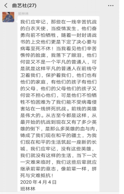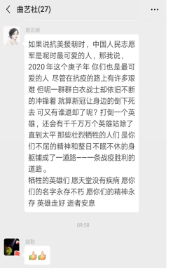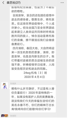 本次悼念活動(dòng)分為兩部分:1.在早晨九點(diǎn)五十之前在微信群發(fā)布緬懷先烈文字,向疫情期間犧牲的最可愛的人致敬;2.全體社團(tuán)成員在家衣著整齊,十點(diǎn)整進(jìn)行默哀儀式。