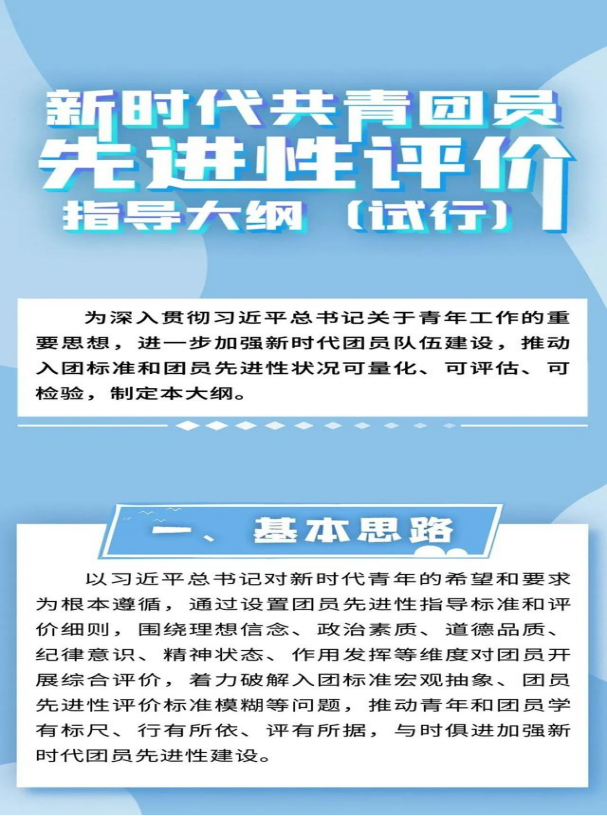 近期,團中央辦公廳印發(fā)《新時代共青團員先進性評價指導(dǎo)大綱(試行)》,明確了新時代團員先進性指導(dǎo)標(biāo)準(zhǔn)和分領(lǐng)域具體評價要求,也為各領(lǐng)域發(fā)展團員提供了具體參考。