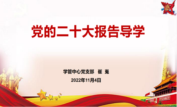 學(xué)管中心黨支部書(shū)記崔嵬帶領(lǐng)全體黨員同志認(rèn)真學(xué)習(xí)了黨的二十大報(bào)告精神,進(jìn)行了二十大報(bào)告學(xué)習(xí)輔導(dǎo)專(zhuān)題黨課教育,內(nèi)容涵蓋二十大報(bào)告的主題等主要精神概況,以及報(bào)告中關(guān)于教育育人等重點(diǎn)內(nèi)容,并強(qiáng)調(diào)學(xué)習(xí)黨的二十大精神要入腦、入心,要全方位的學(xué)習(xí),要從黨的二十大報(bào)告中汲取奮進(jìn)新征程的力量,自覺(jué)把思想和行動(dòng)統(tǒng)一到黨的二十大精神上來(lái),把精神落實(shí)到各項(xiàng)本職工作當(dāng)中。