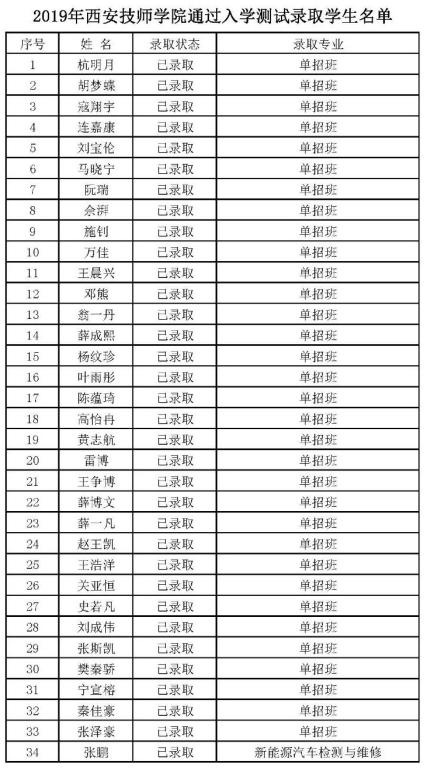 2019年西安技師學(xué)院通過入學(xué)測試錄取學(xué)生名單