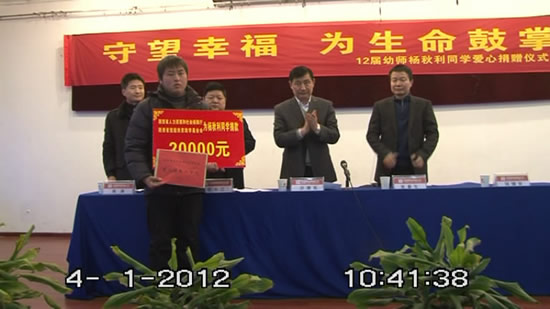 學院2012屆幼兒師范專業(yè)中專學生楊秋利同學被西京醫(yī)院確診為淋巴急性白血病,需進行造血干細胞移植,方可痊愈,巨額的開支遠遠超出其家庭的承受能力。學院得知消息后,第一時間在全院范圍發(fā)起“捐獻愛心互幫扶困”的倡議,得到了全院師生的積極響應。在捐贈儀式上,陜西省人力資源和社會保障廳副廳長沙德憲將陜西省技能扶貧助學基金會捐贈的2萬元交與楊秋利同學的家人,鼓勵家人樹立信心,勇敢面對困難。學院院長李長江代表學院捐贈2萬元愛心善款。楊秋利的家人接收了捐款,代表楊秋利及全家感謝陜西省人力資源和社會保障廳、陜西省技能扶貧助學基金會等相關部門和領導,感謝西安技師學院和全院師生對于楊秋利的關懷和對自己家庭的大力幫助!