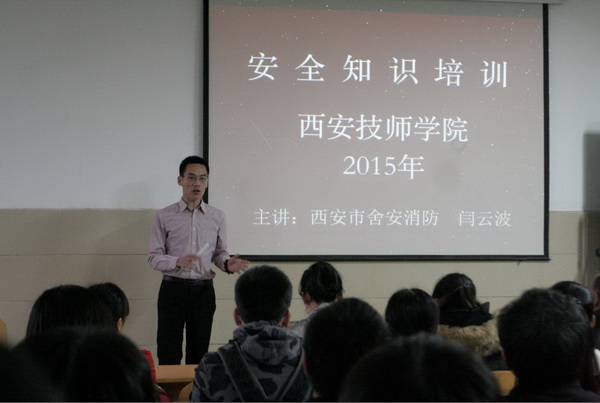 西安技師學院十分重視校園消防安全工作,根據(jù)集團公司保衛(wèi)部2015年119消防宣傳工作通知精神,學院保衛(wèi)處及早安排布置,11月11日,學院保衛(wèi)處聘請西安市保安防火中心閆云波主任對我院行政人員、班主任、在校外包經營負責人及2015年新生各班班長共200余人,進行了一次校園安全逃生技能、消防意識教育培訓。會后,組織參會人員進行了消防實戰(zhàn)演練。