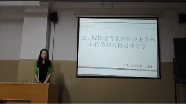 5月25日下午四點,C座401教室里不時傳來陣陣掌聲。信息藝術(shù)系劉薇老師對全體信息藝術(shù)系老師及學(xué)生管理人員做了一次精彩的培訓(xùn)分享。此次技工院校德育課暨社會主義核心價值觀教育培訓(xùn)是4月19日到22日在北京舉行的,培訓(xùn)共分三個部分:社會主義核心價值觀——解析、培育、踐行,技工院校德育課程標(biāo)準(zhǔn)解讀及德育課教材特點及教學(xué)解析;微課展示及點評;參觀北京應(yīng)用高級技工學(xué)校。劉薇老師著重介紹了微課及參觀感受。