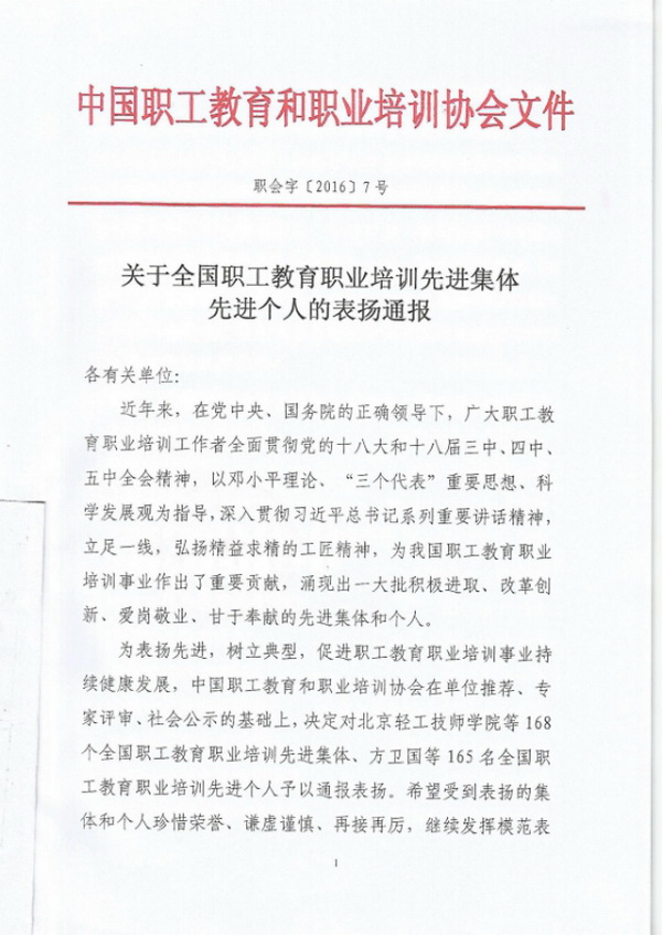 榮獲全國(guó)職工教育職業(yè)培訓(xùn)先進(jìn)集體榮譽(yù)稱(chēng)號(hào)