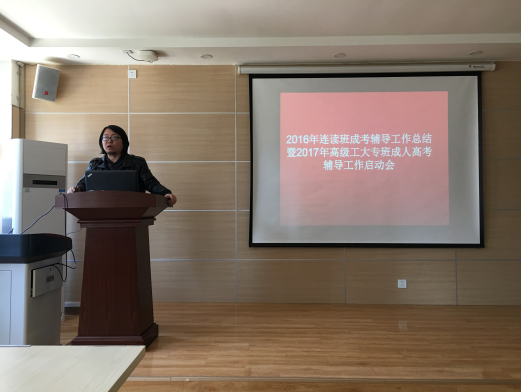 會上,公共課教研室主任陳宏茹老師總結(jié)了2016年連讀班成考輔導(dǎo)工作,她在總結(jié)中肯定了班主任老師的辛勤付出和代課老師的教學(xué)創(chuàng)新,正是因?yàn)榇蠹业凝R心協(xié)力,2016年學(xué)生的成人高考通過率達(dá)到86%。隨后,學(xué)生工作處處長崔嵬向參會人員詳細(xì)說明了學(xué)生連讀后的學(xué)籍管理和學(xué)制變動情況;招生辦主任賈靖就有關(guān)連讀學(xué)生招生宣傳政策做了詳盡的解讀;信息與藝術(shù)系主任王楠代表全系老師表態(tài),他表示全系教師將以更大的信心和努力,做好2017年成人高考輔導(dǎo)工作,并就新一屆連讀班的班級管理和教學(xué)工作提出具體要求。