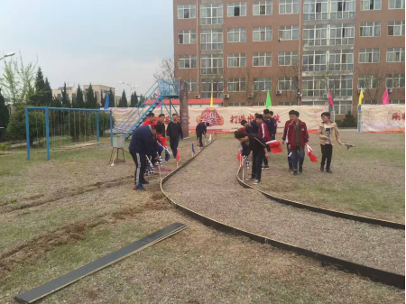 學(xué)生志愿者在老師的帶領(lǐng)下為遙控車賽場跑道插旗