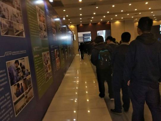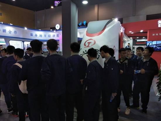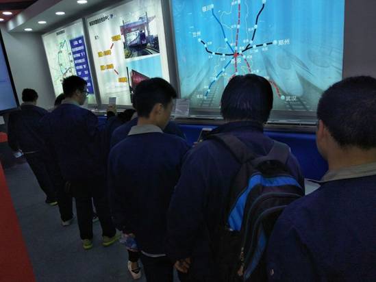 進(jìn)入展廳,映入眼簾的是過道兩側(cè)長約百米的大國工匠和勞模先進(jìn)事跡,參展師生邊走邊看,繼而走進(jìn)展區(qū),動車組,航空,數(shù)控……
