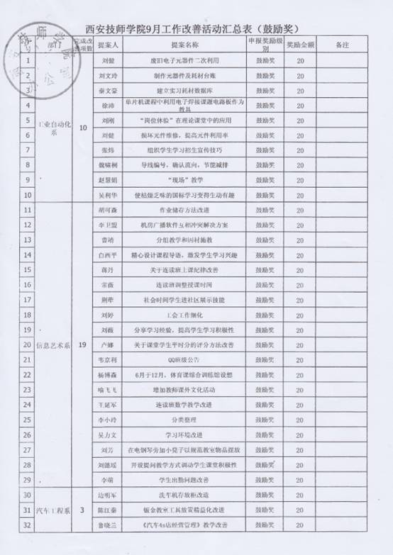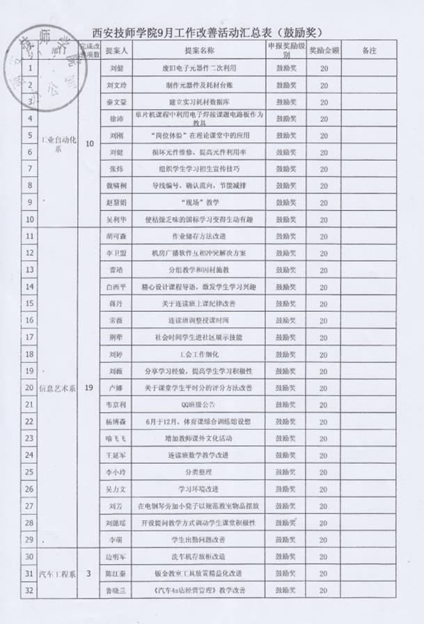 在個人方面,劉建、夏瑩、趙耿和王斌老師在廢舊利用方面的改善值得表揚,變廢為寶,為學院節(jié)約了開支;財務處祝暉老師的改善提高了工作效率;劉薇和白西平老師改善了教學方法,提高了學生的學習興趣;后勤管理中心的魏鑫、高長喜老師在5S定制管理方面的提案值得借鑒。為了解決問題悉心鉆研,提出方案、實施改善、實現(xiàn)目標、得到獎勵,每一位參與改善提案活動的老師,都得到了一次自我的鍛煉與成長。