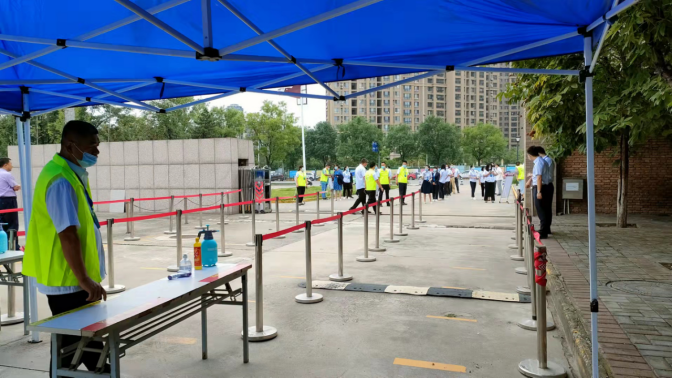 上午9時(shí),演練正式開(kāi)始。由各系抽選的40名班主任充當(dāng)“學(xué)生”,間距一米,整齊有序在學(xué)院北大門(mén)外排隊(duì),實(shí)景模擬入校場(chǎng)景。門(mén)口設(shè)置三個(gè)檢測(cè)口,每個(gè)檢測(cè)口均安排人員進(jìn)行測(cè)溫、掃碼、登記報(bào)到情況、維持秩序。