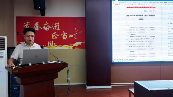 王博副主任就2022年秋季開學(xué)準備工作和報到流程進行了具體部署和安排,要求全體班主任要熟悉掌握報到流程,幫助新老生順利完成報到,安排好學(xué)生報到后的學(xué)習(xí)生活。