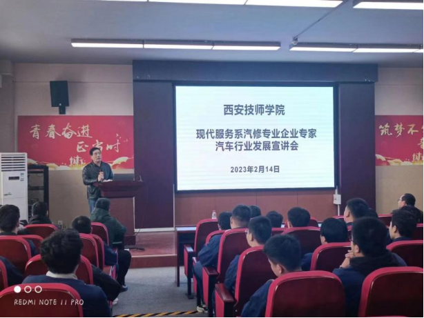 崗位實習前,現(xiàn)代服務(wù)系副主任冀芳、西安市汽車協(xié)會會長張光明以及6家企業(yè)人力資源負責人參加汽修專業(yè)學生崗位實習動員會。
