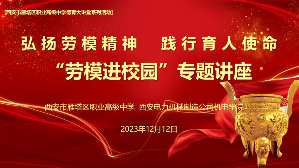 為大力弘揚(yáng)勞模精神、勞動(dòng)精神、工匠精神,使廣大青少年近距離接觸勞動(dòng)模范、體悟勞模精神、聆聽(tīng)勞動(dòng)故事,激發(fā)學(xué)生愛(ài)勞動(dòng)、學(xué)技能的熱情,12月12日下午,我院與西安市雁塔區(qū)職業(yè)高級(jí)中學(xué)聯(lián)合開(kāi)展“弘揚(yáng)勞模精神踐行育人使命”勞模進(jìn)校園宣講活動(dòng)。學(xué)院電氣技術(shù)系副主任王博、招就辦就業(yè)主管孫西強(qiáng)、專業(yè)教師趙慧娟陪同全國(guó)技術(shù)能手、陜西省勞動(dòng)模范、西安市職業(yè)技能帶頭人曾國(guó)榮同志前往西安市雁塔區(qū)職業(yè)高級(jí)中學(xué)開(kāi)展宣講活動(dòng)。
