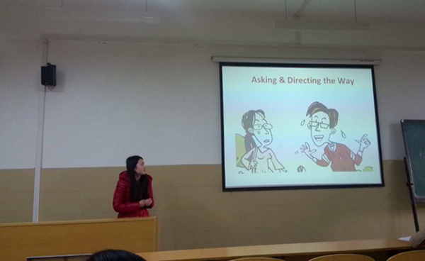 蔣丹老師在講“Asking & Directing the Way”,結(jié)合職業(yè)院校學(xué)生特點(diǎn),蔣老師制作了精美的課件,詳細(xì)講解了學(xué)生在口語(yǔ)交際中經(jīng)常出現(xiàn)的問(wèn)題,使學(xué)生在短短的幾分鐘里全面掌握了問(wèn)路和指路的口語(yǔ)交流。