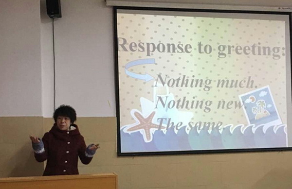 劉婷老師在講“Greeting people met often”劉老師把耳熟能詳?shù)膯?wèn)候語(yǔ)一一道來(lái),使學(xué)生在信心滿滿的口語(yǔ)交流之余,收獲了地道的美式口語(yǔ)。