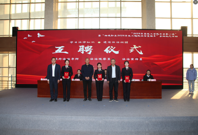 在校外法治導(dǎo)師、法治觀察員、法治宣傳員互聘儀式環(huán)節(jié),臺上領(lǐng)導(dǎo)分別為三名校外法治導(dǎo)師、兩名法治觀察員、八名法治宣傳員頒發(fā)聘書。一紙聘書,承載著沉甸甸的責(zé)任,也寄托著對校園法治教育工作的殷切期望。