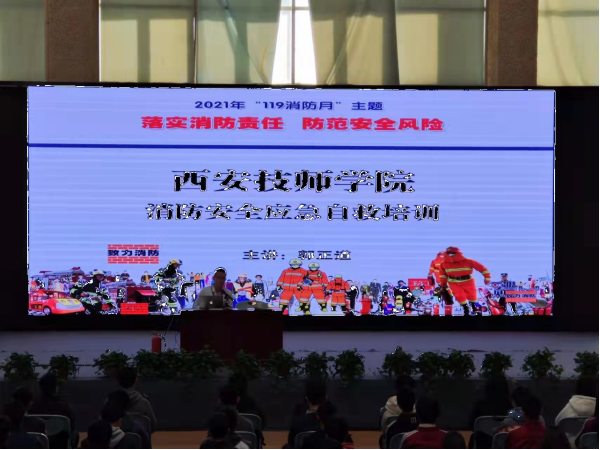 為全面落實(shí)學(xué)院消防安全工作,增強(qiáng)全院師生消防安全意識(shí),提高火災(zāi)現(xiàn)場(chǎng)的逃生技能,促進(jìn)學(xué)院消防安全工作規(guī)范化管理。11月25日下午,學(xué)院邀請(qǐng)陜西省致力誠(chéng)安防技術(shù)服務(wù)有限公司郭正道講師進(jìn)行“119”消防安全教育培訓(xùn),學(xué)生、教職工、教官、第三方負(fù)責(zé)人等代表共計(jì)400余人參加培訓(xùn)。