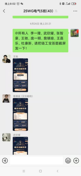 活動(dòng)開(kāi)展中,許多班主任在第一時(shí)間將參賽方式和參賽通知發(fā)送至班級(jí)微信群和QQ群,鼓勵(lì)學(xué)生積極參與競(jìng)賽,在全系范圍內(nèi)掀起了借助“鏈工寶”參加全國(guó)安全月網(wǎng)絡(luò)知識(shí)競(jìng)賽的熱潮。